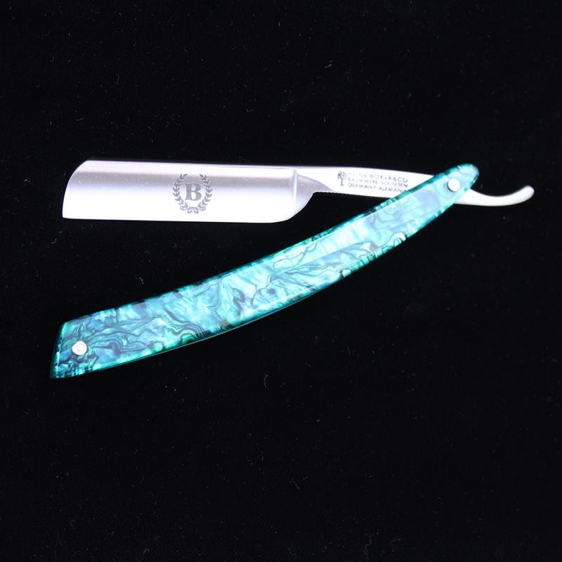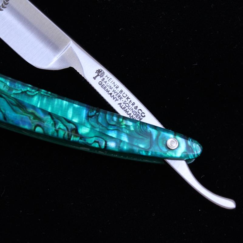 The extra hollow blade has the Boker wreath motif in black and has a French nose, something unusual in a small razor. The tang is stamped with the Boker marks and has jimping to upper and lower sides.