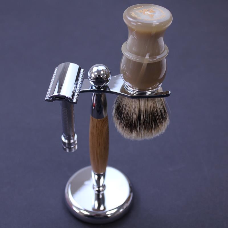 This stand is capable of holding two pieces, typically a brush and a safety razor. The elegant and stylish stand has a chrome finish save for the wood effect upright.