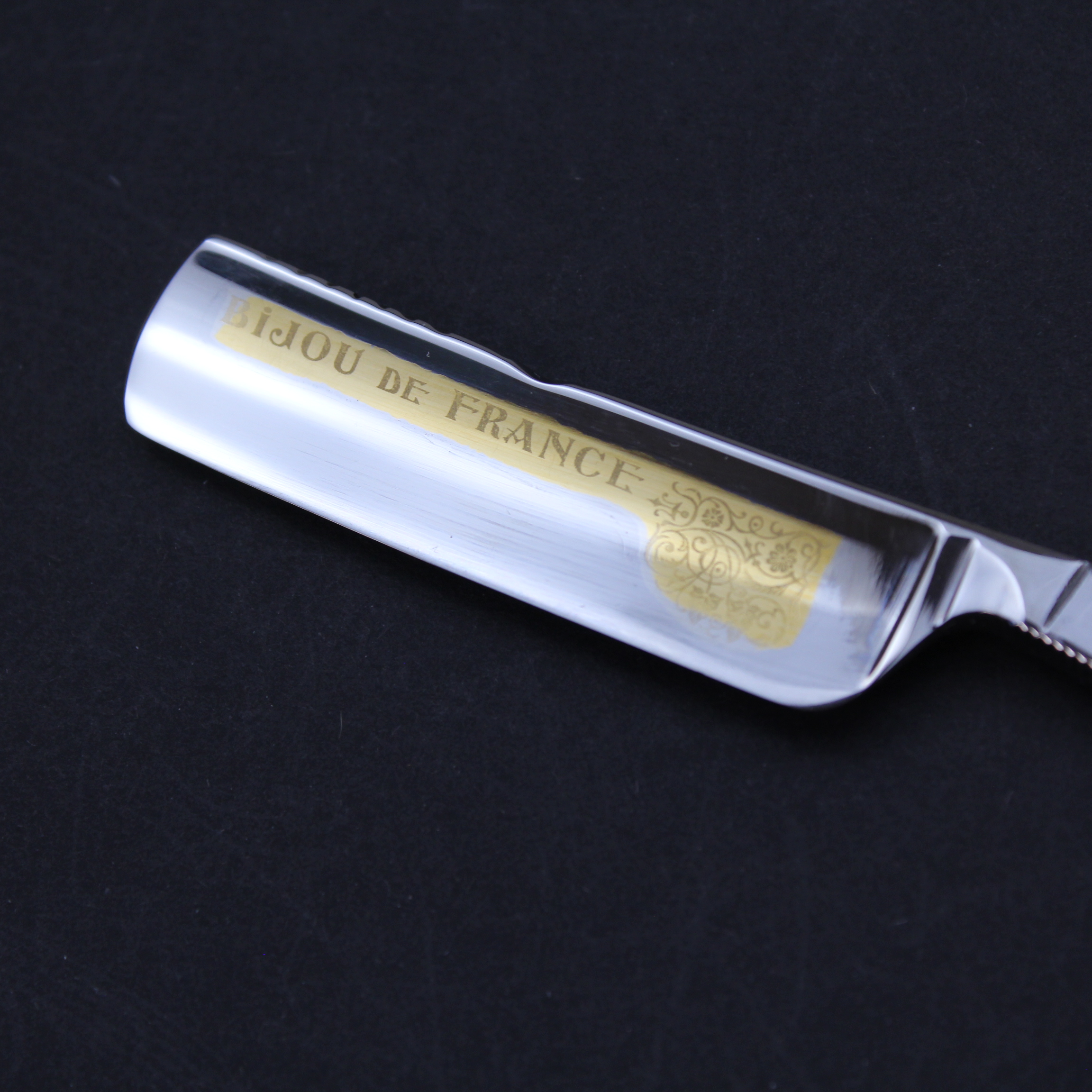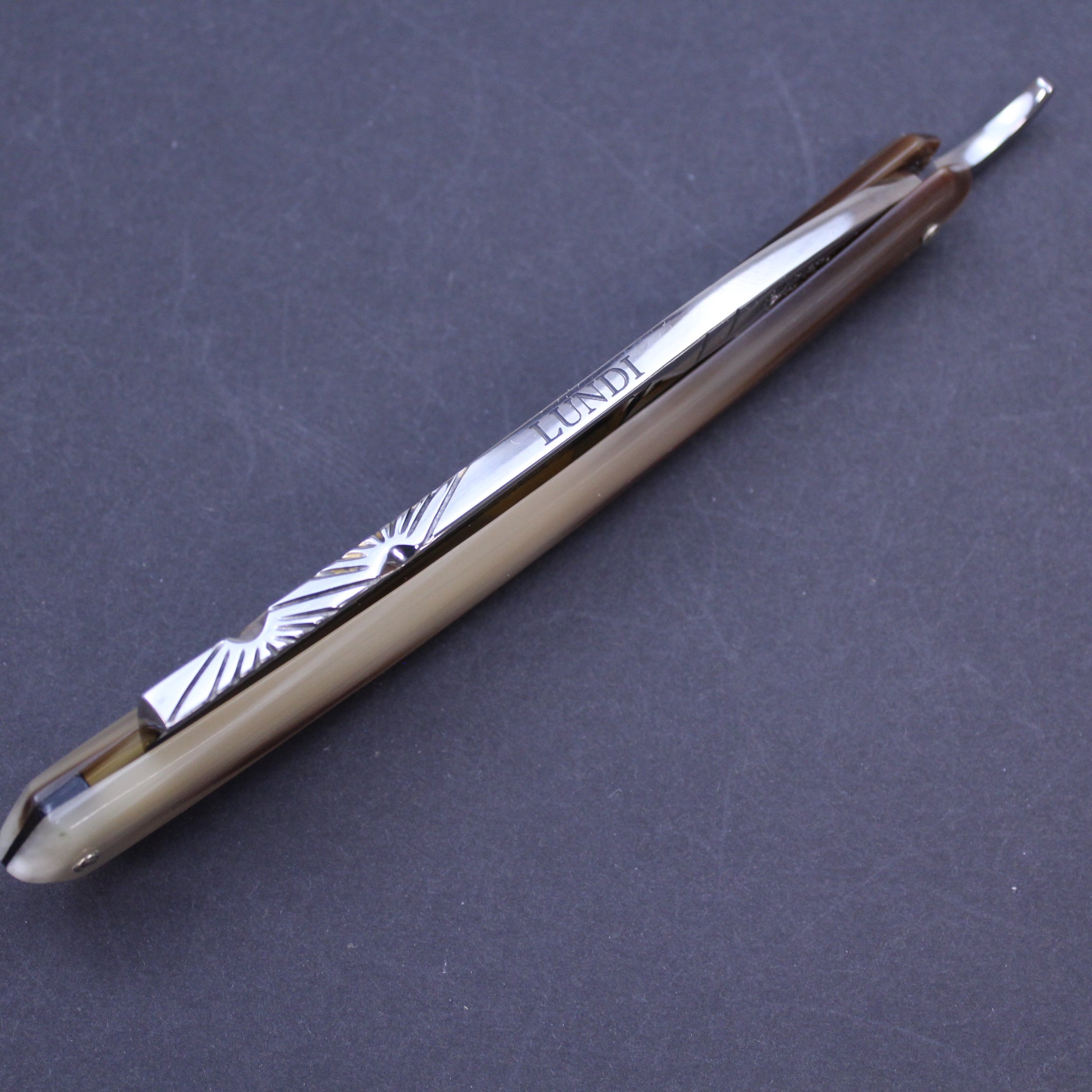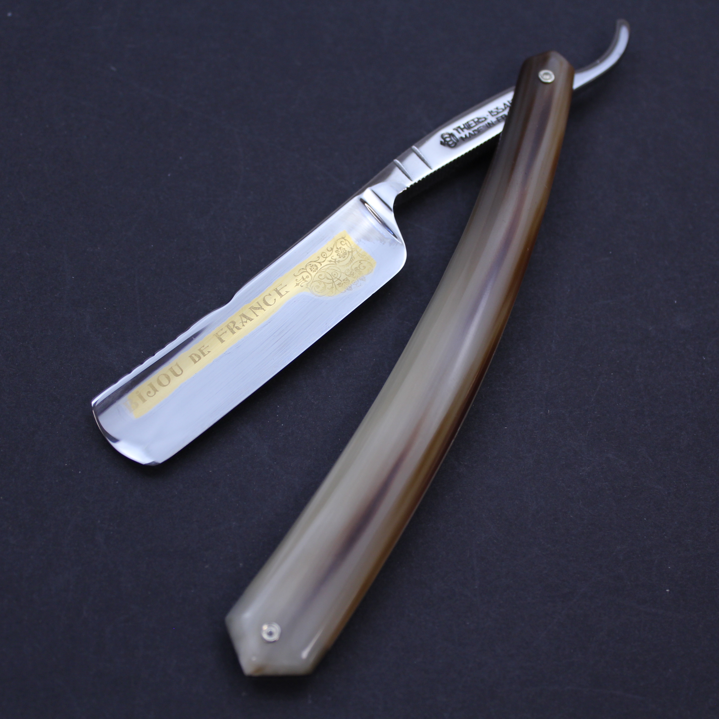 This pre-owned Bijou de France 5/8 razor from Thiers-Issard has stunning blonde horn scales which are a blend of dark brown and pale ivory in a wonderful striped pattern which itself is quite unusual. It has a handworked sun design spine etched with “Lundi” (Monday). The mirror finished blade has the Bijou de France mark in gold on the front. There is jimping to the lower tang and the tang itself bears the Thiers Issard logo with the words “Made in France”.