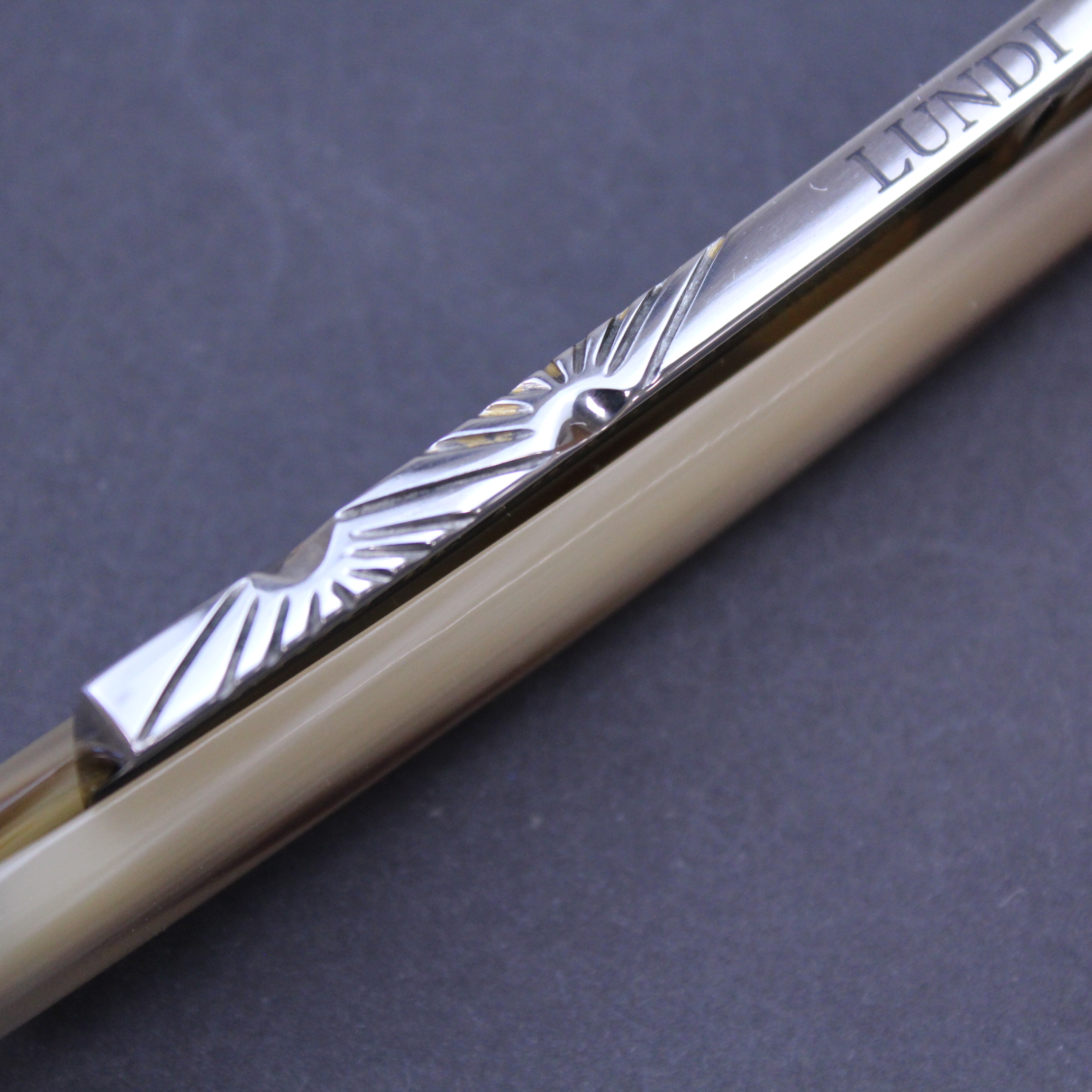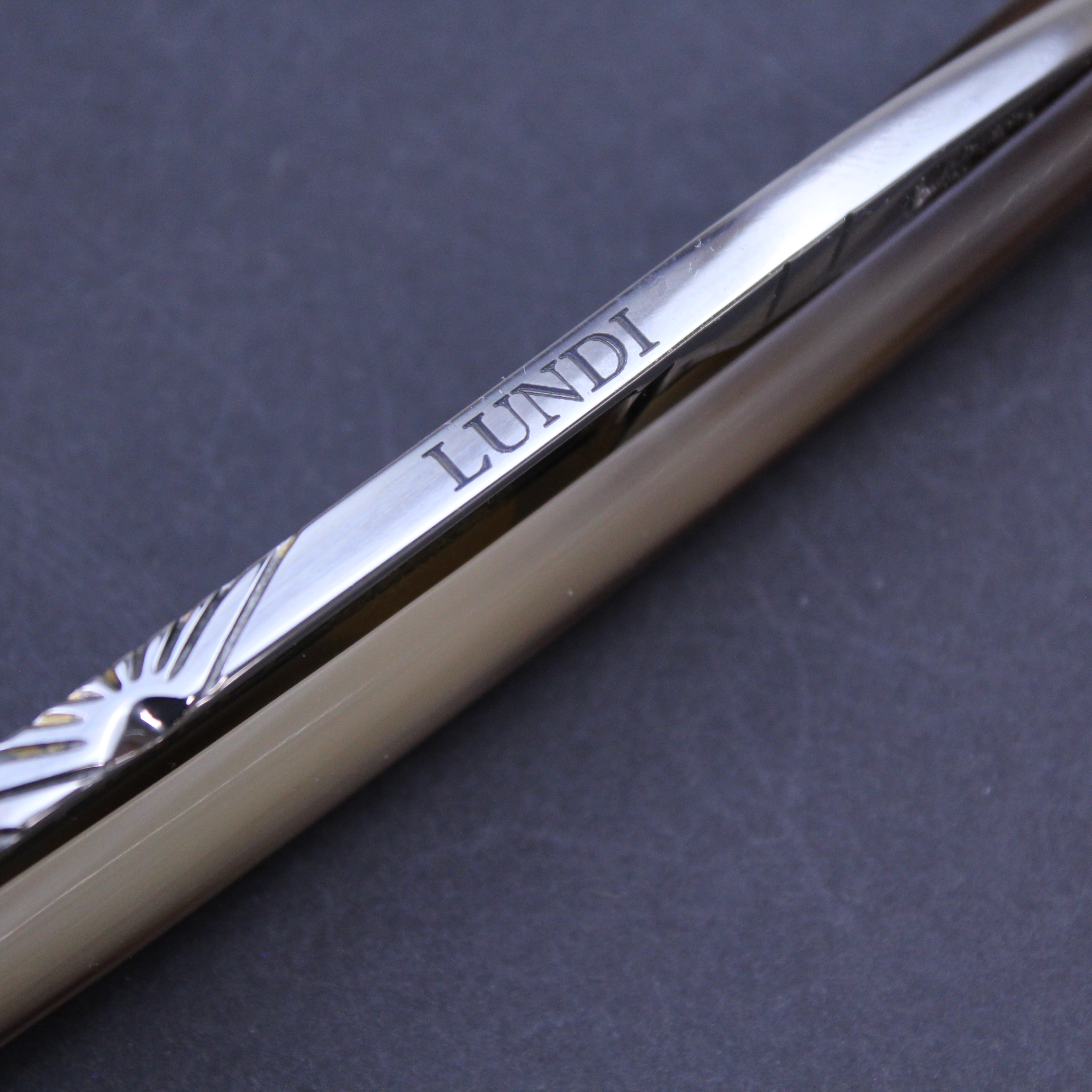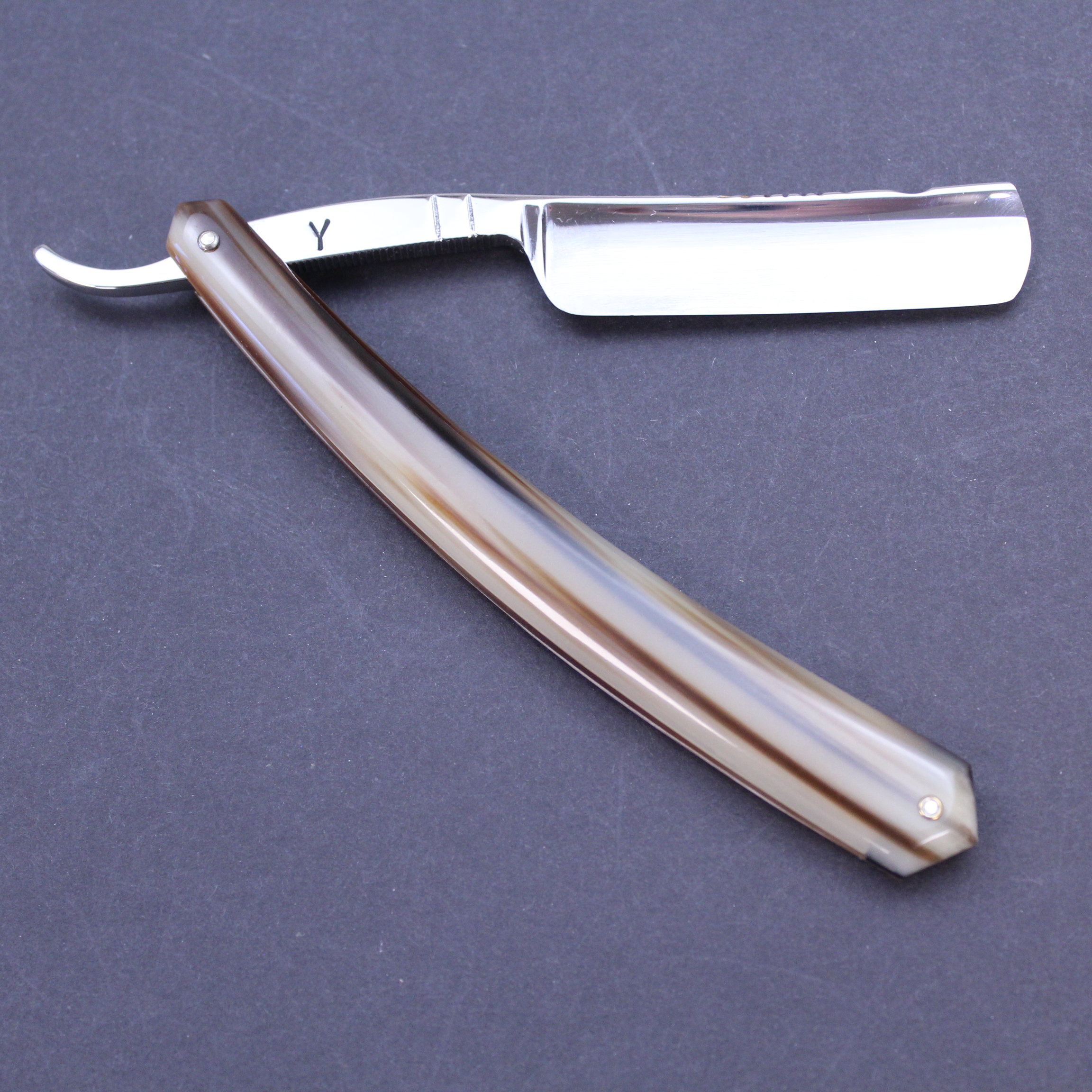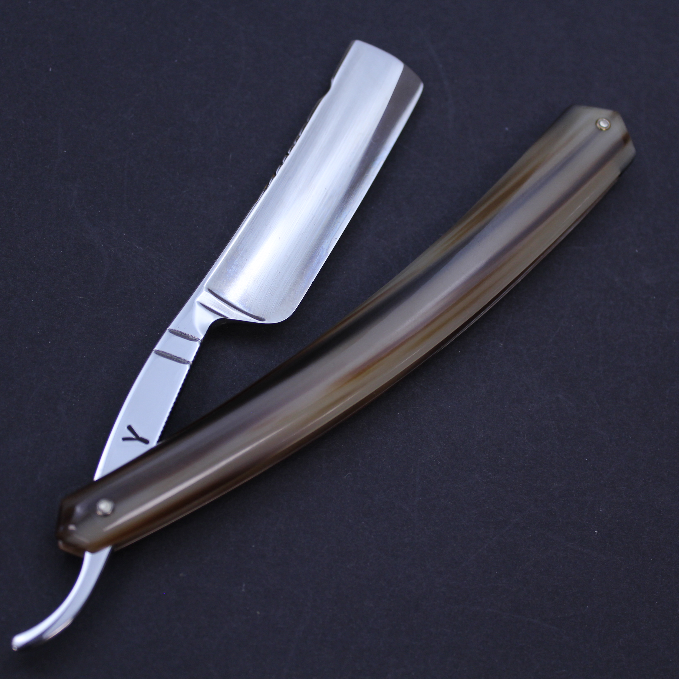This pre-owned Bijou de France 5/8 razor from Thiers-Issard has stunning blonde horn scales which are a blend of dark brown and pale ivory in a wonderful striped pattern which itself is quite unusual. It has a handworked sun design spine etched with “Lundi” (Monday). The mirror finished blade has the Bijou de France mark in gold on the front. There is jimping to the lower tang and the tang itself bears the Thiers Issard logo with the words “Made in France”.