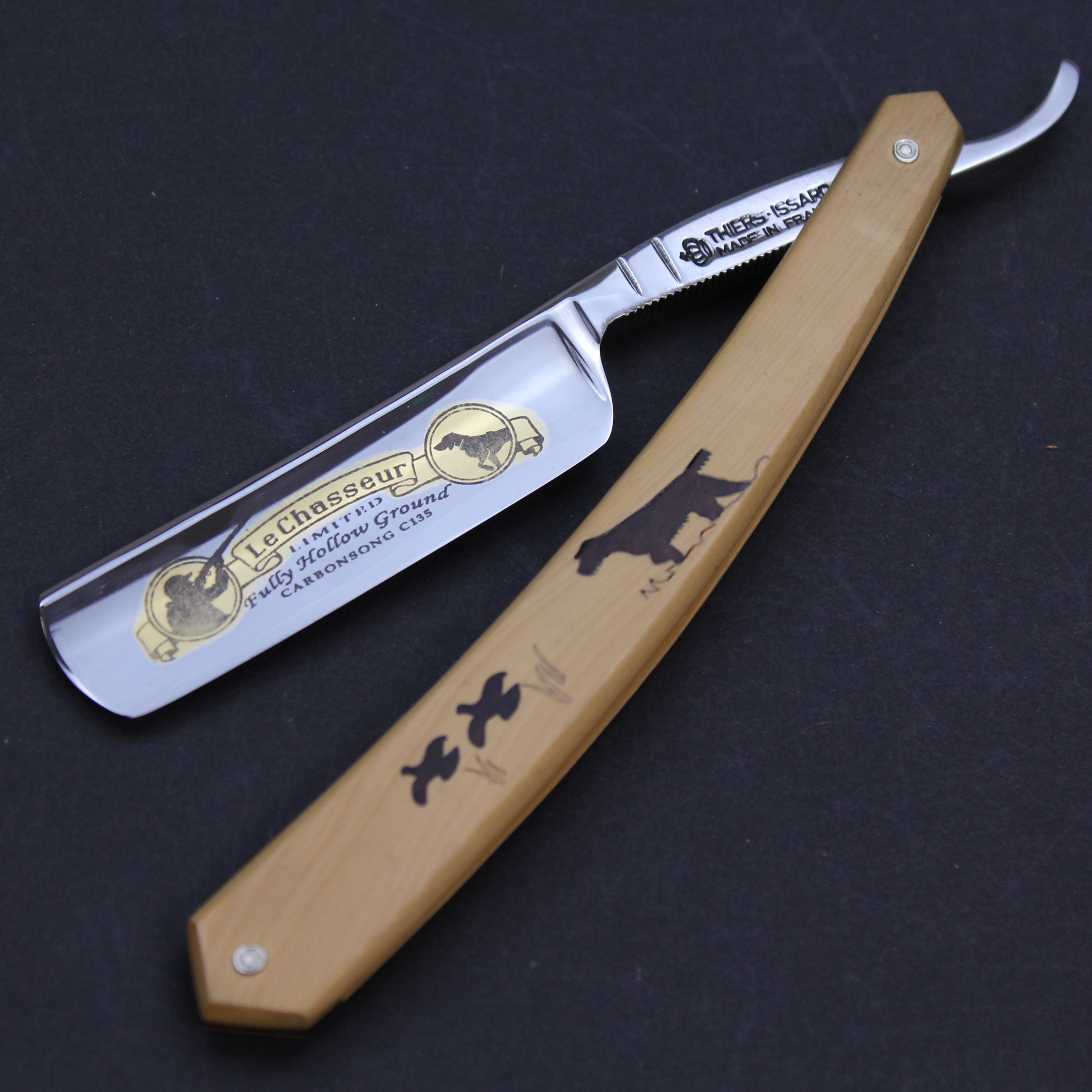 This pre-owned Le Chasseur Dog Hunt razor from Thiers-Issard has boxwood scales inlaid with pictures of a hunting dog and two birds in flight. “Le Chasseur” means “The Hunter” and this razor is ideal for any customer with an interest in hunting.