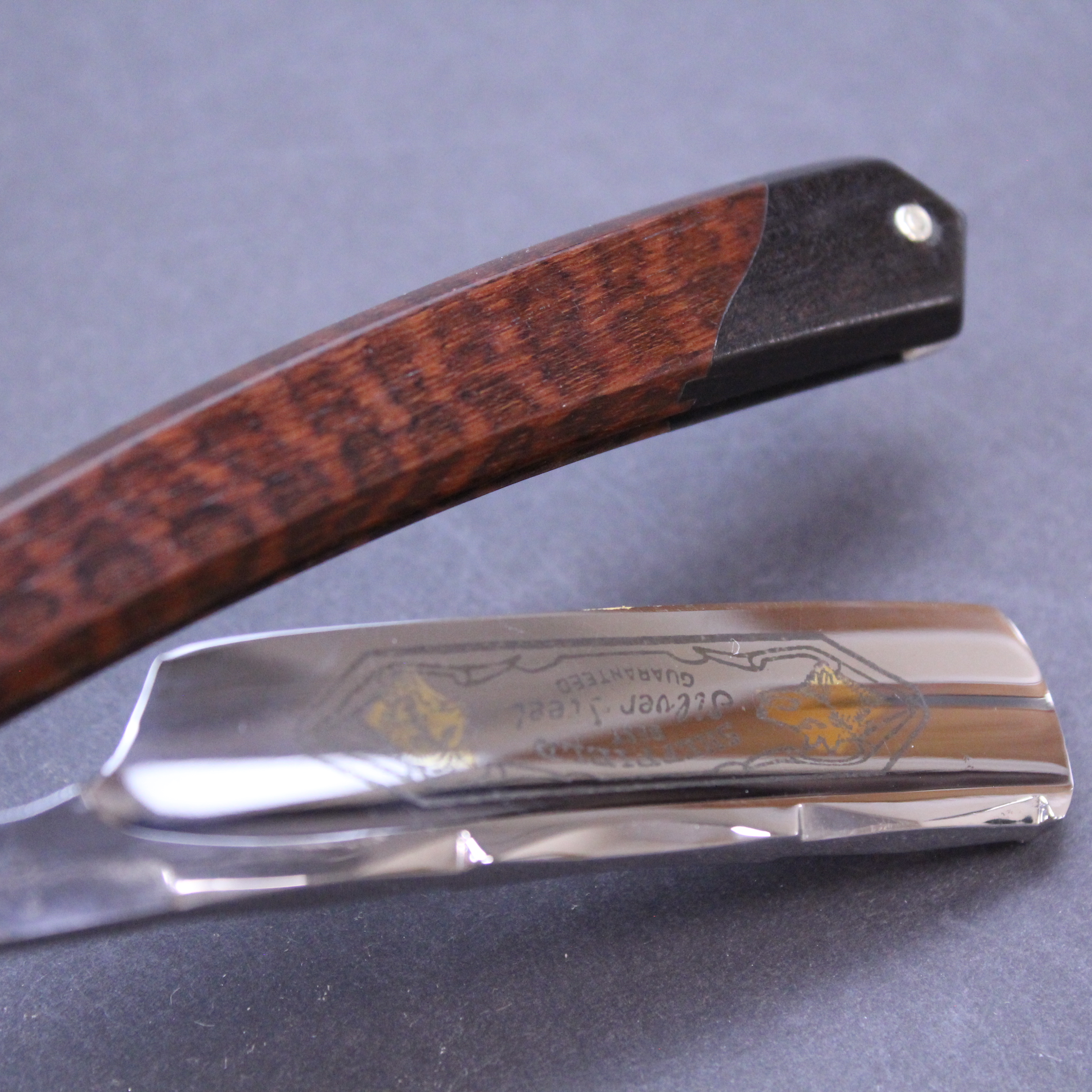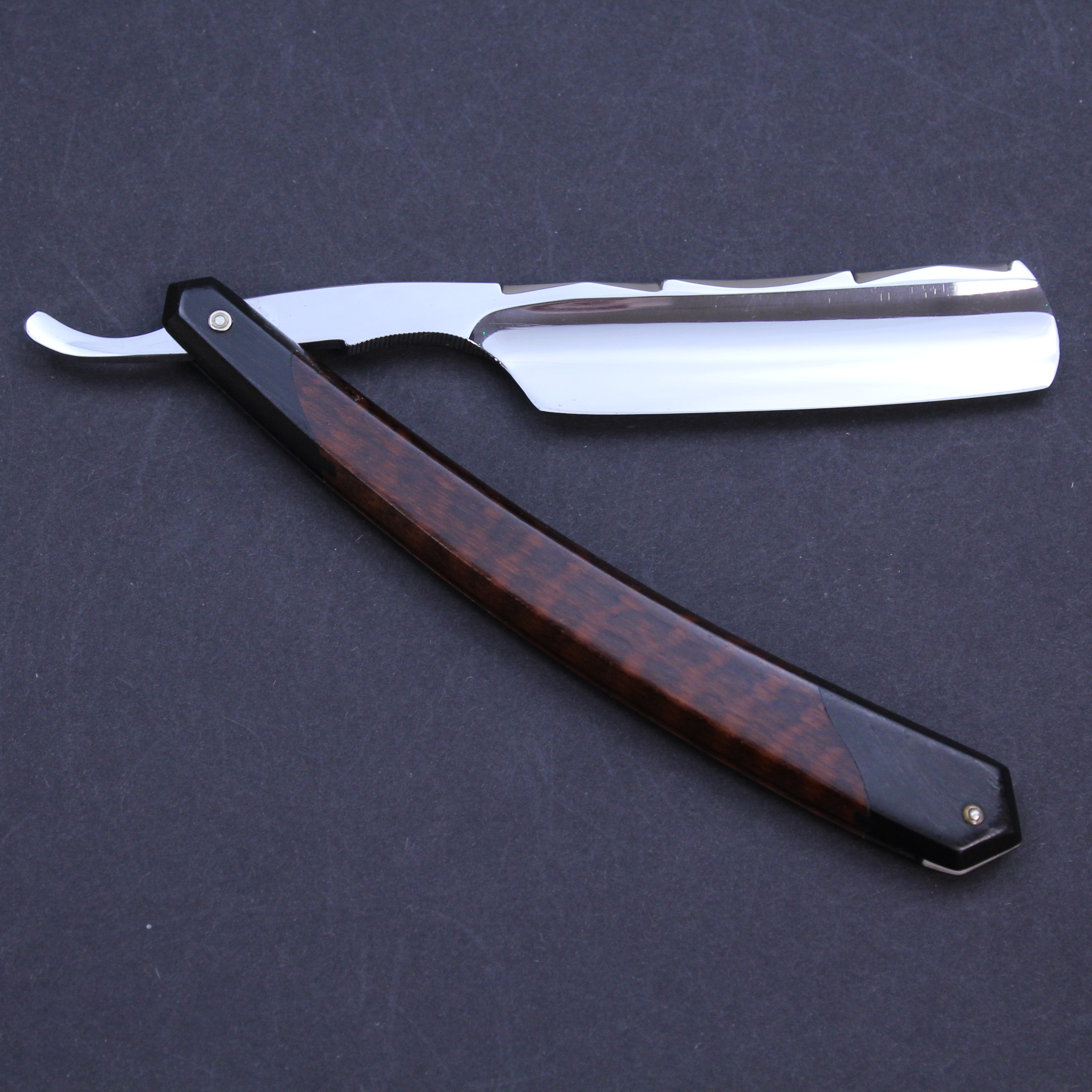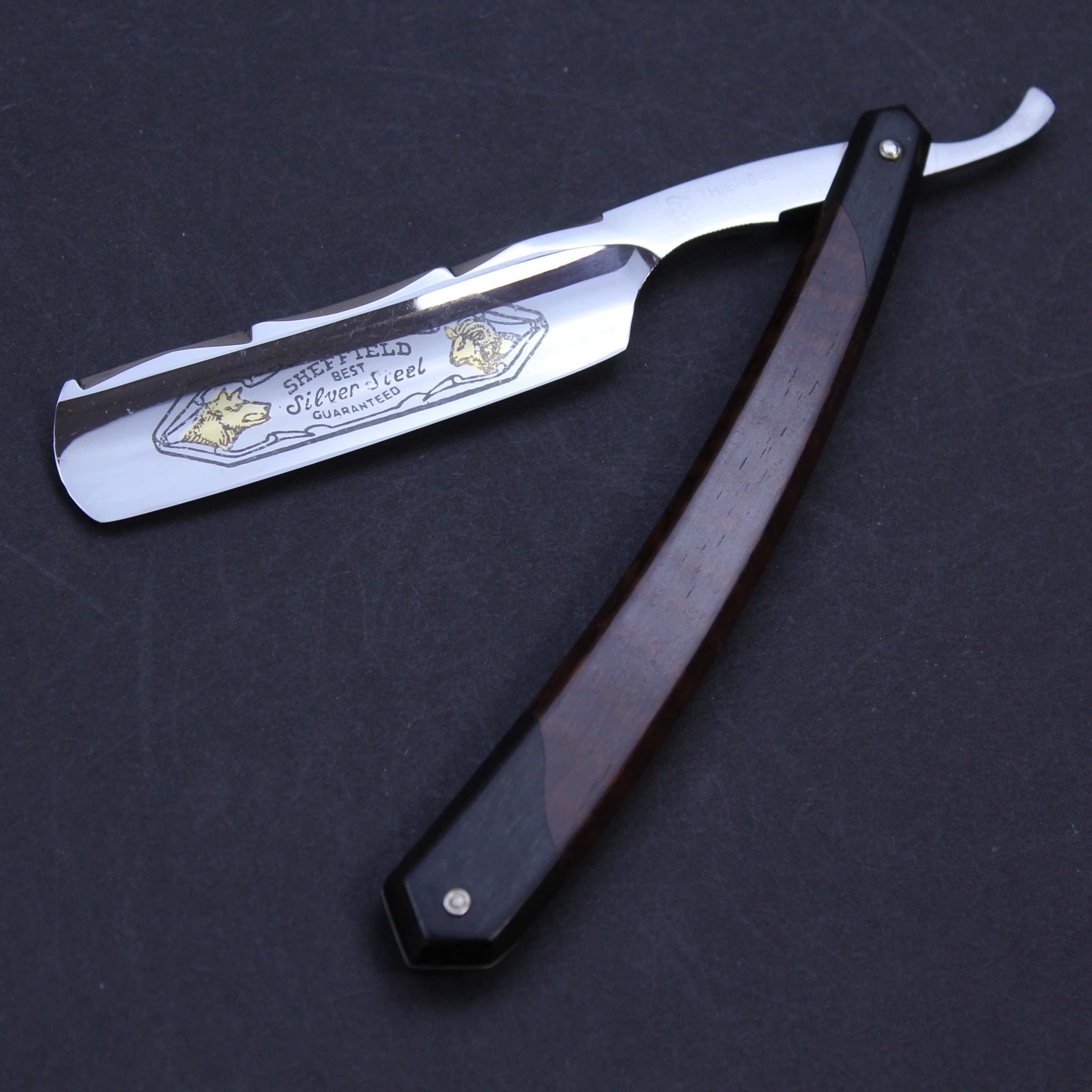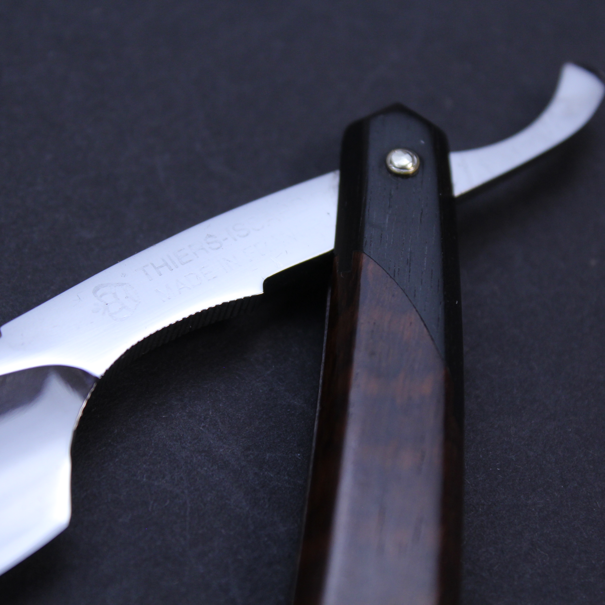 This is a pre-owned 6/8 Thiers Issard razor which has the Wolf and Ram blade marking in gilt and black on the blade front. The blade is made of carbon steel, has a mirror finish, and a round point. It has a thumb notch with jimping underneath to the lower tang. The spine has the hand worked historic festonne design which is set off beautifully by a the very unusual scales. These are primarily made of snakewood but have (what I believe to be) ebony inset at either end. I have never seen scales like this on another Thiers Issard razor and suspect they may have been a prototype. This razor is being sold on behalf of a collector and is very good condition save for a small trace of corrosion on the blade about one centimetre from the point which can be seen on the photographs.