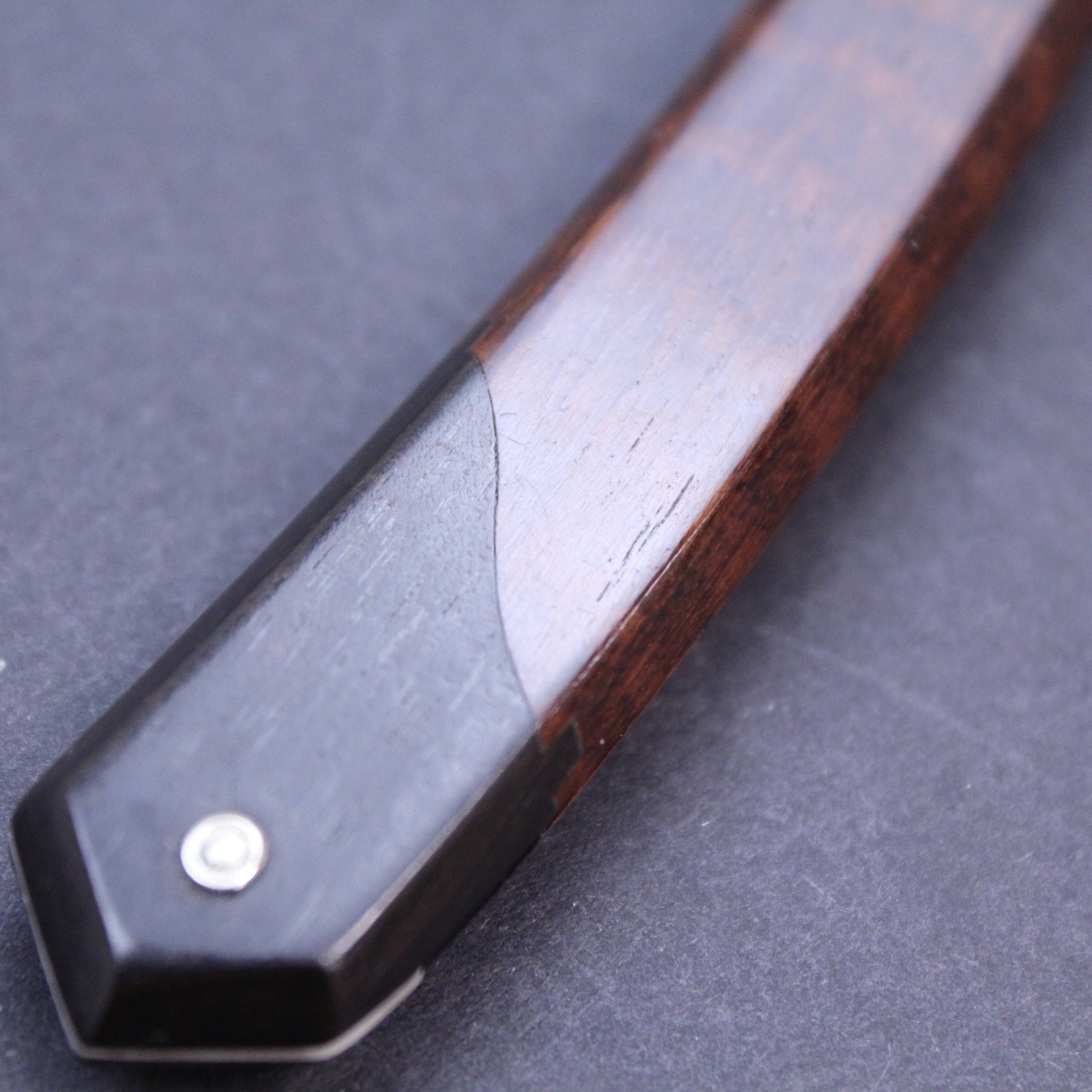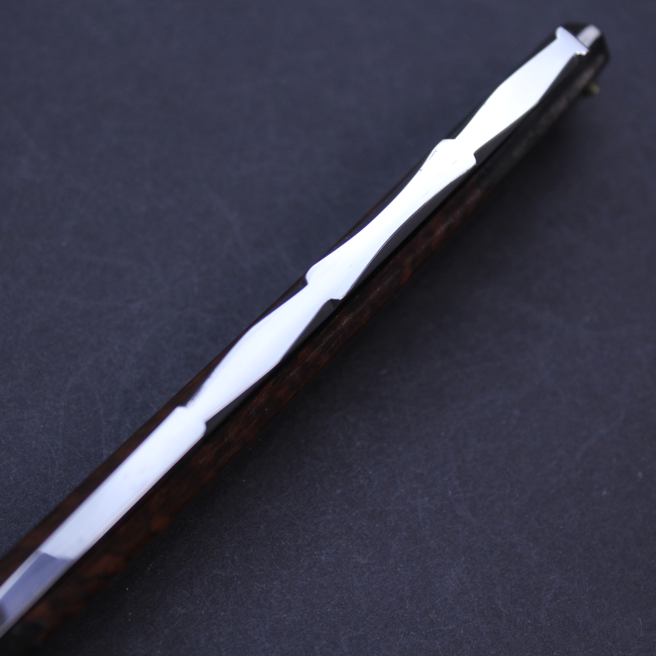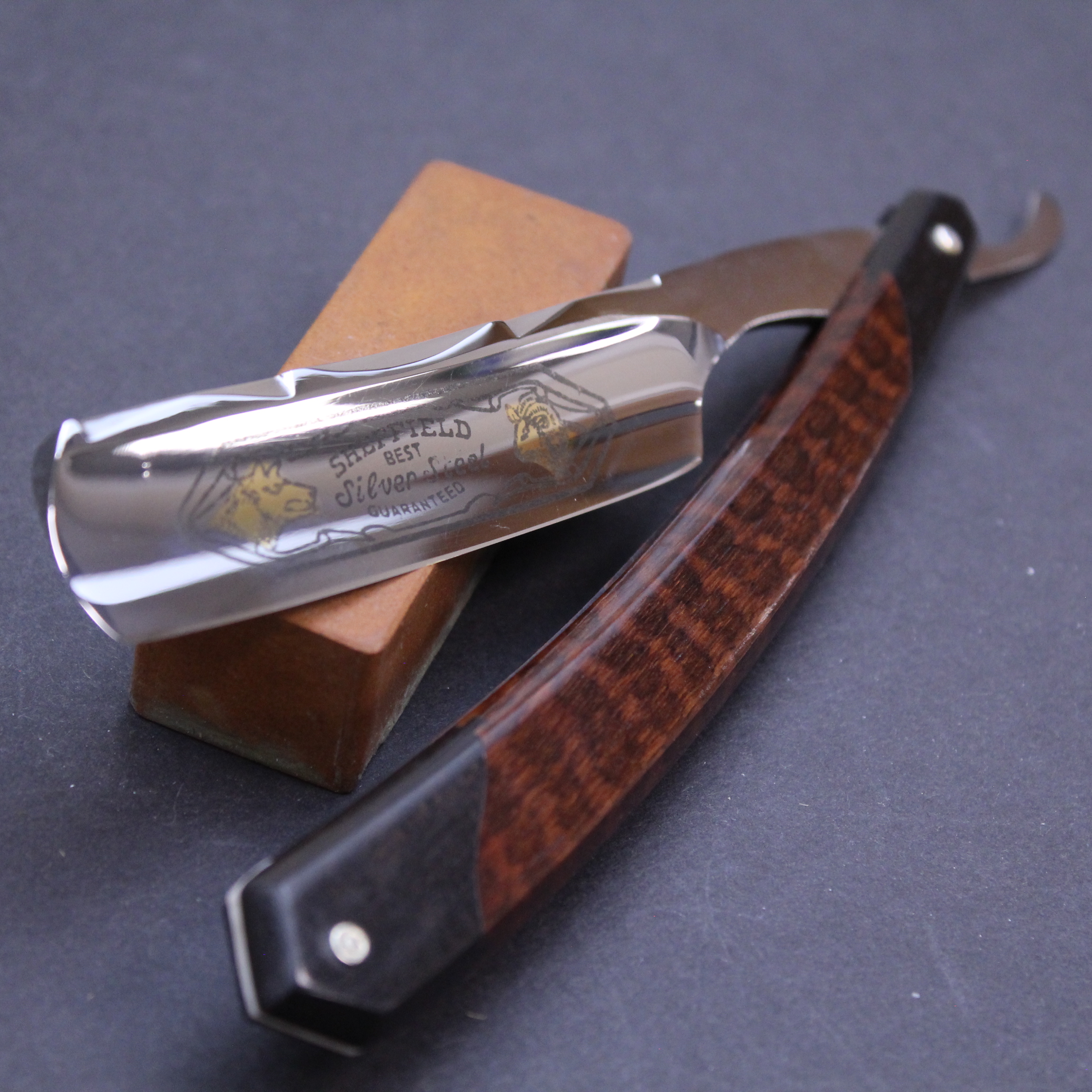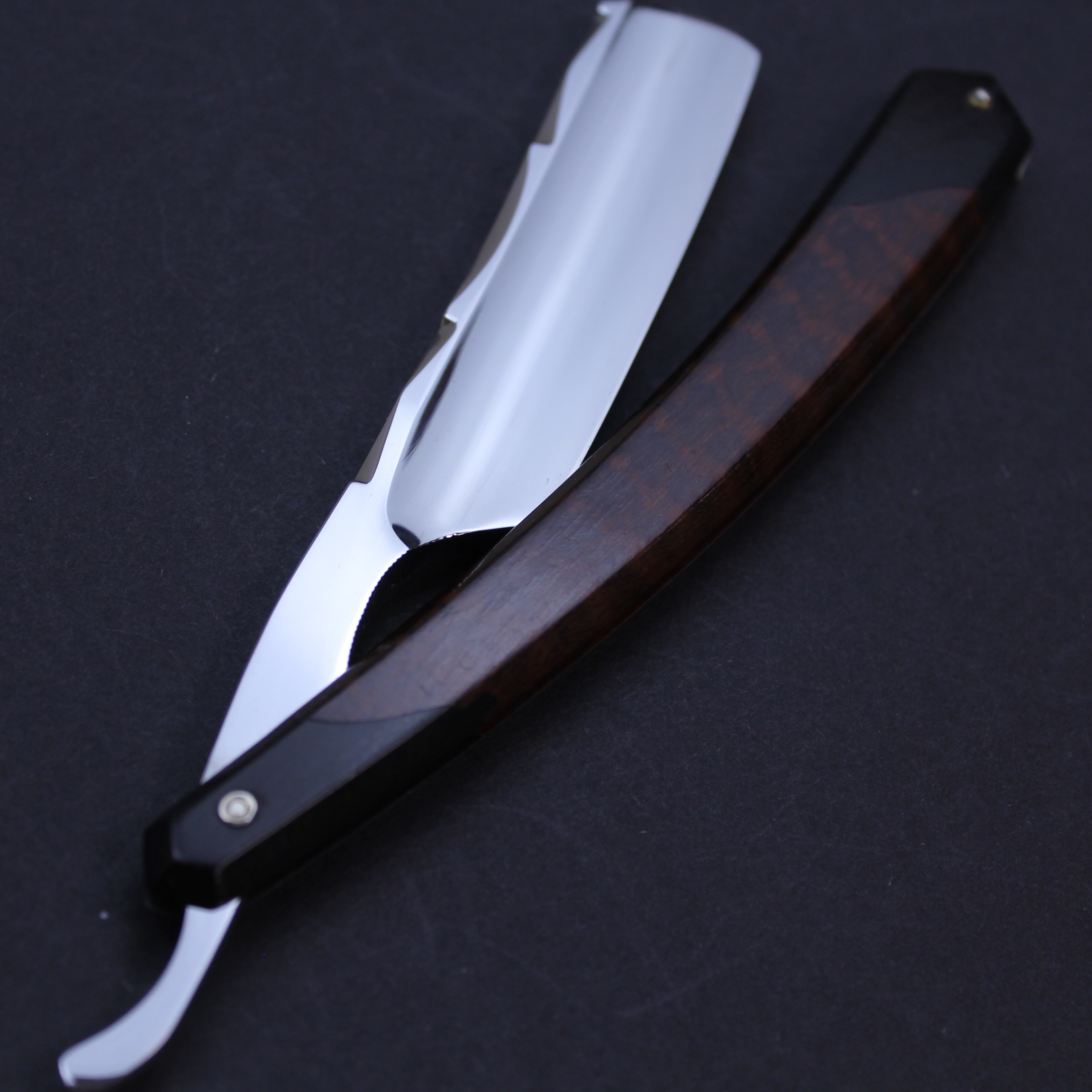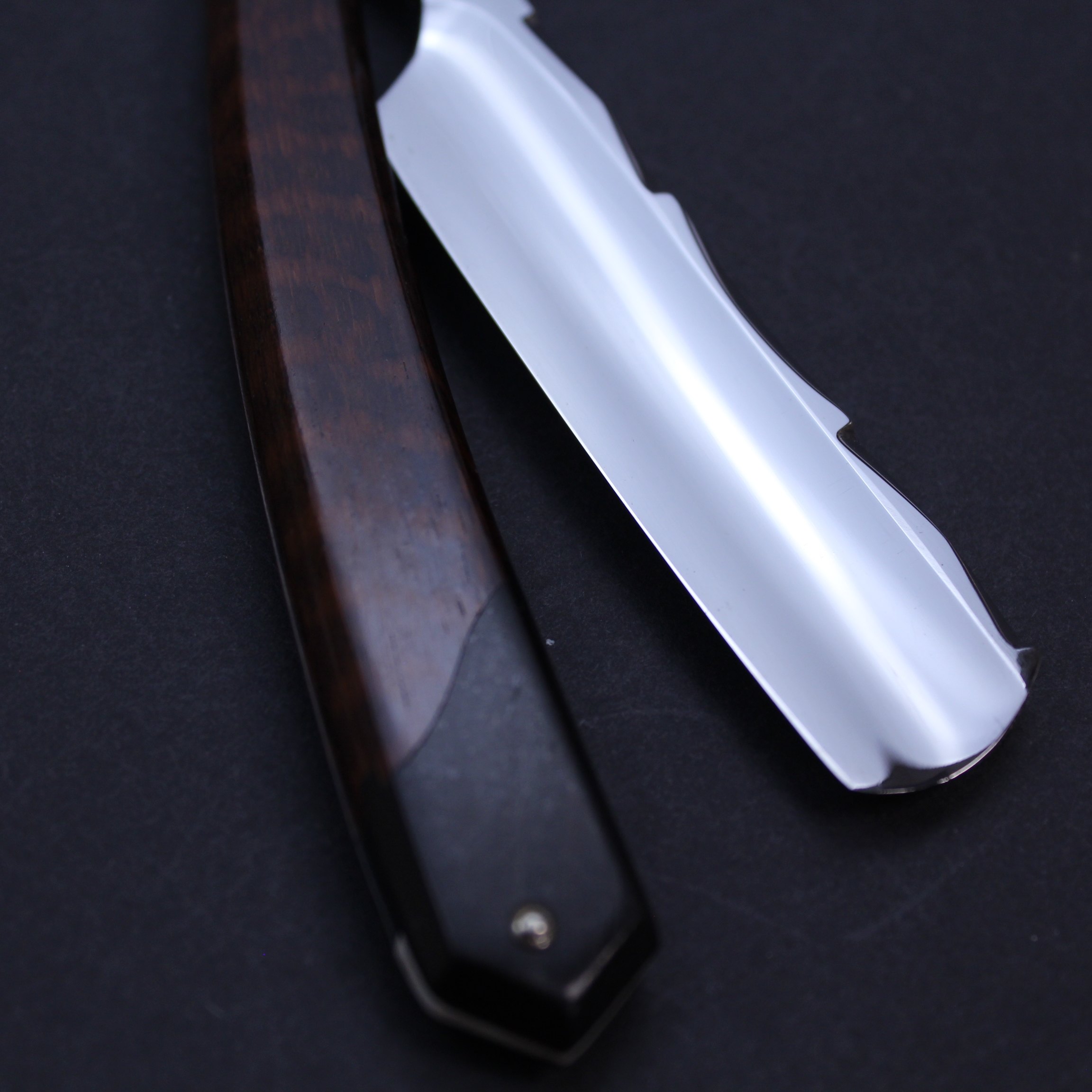 This is a pre-owned 6/8 Thiers Issard razor which has the Wolf and Ram blade marking in gilt and black on the blade front. The blade is made of carbon steel, has a mirror finish, and a round point. It has a thumb notch with jimping underneath to the lower tang. The spine has the hand worked historic festonne design which is set off beautifully by a the very unusual scales. These are primarily made of snakewood but have (what I believe to be) ebony inset at either end. I have never seen scales like this on another Thiers Issard razor and suspect they may have been a prototype. This razor is being sold on behalf of a collector and is very good condition save for a small trace of corrosion on the blade about one centimetre from the point which can be seen on the photographs.