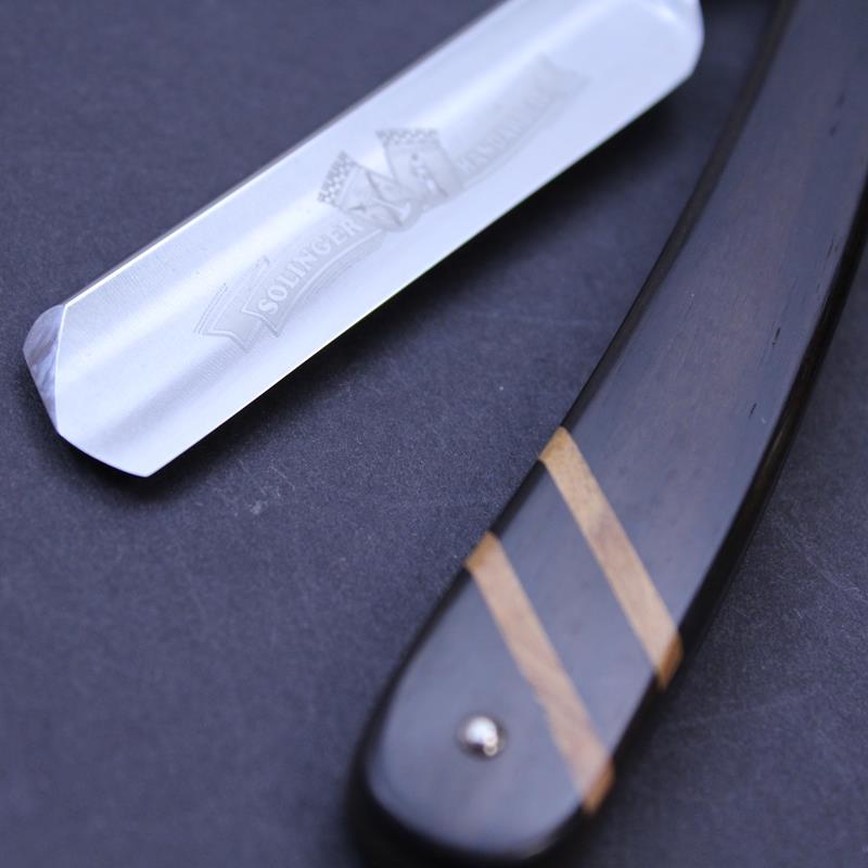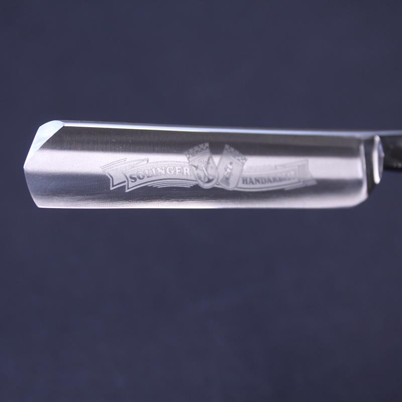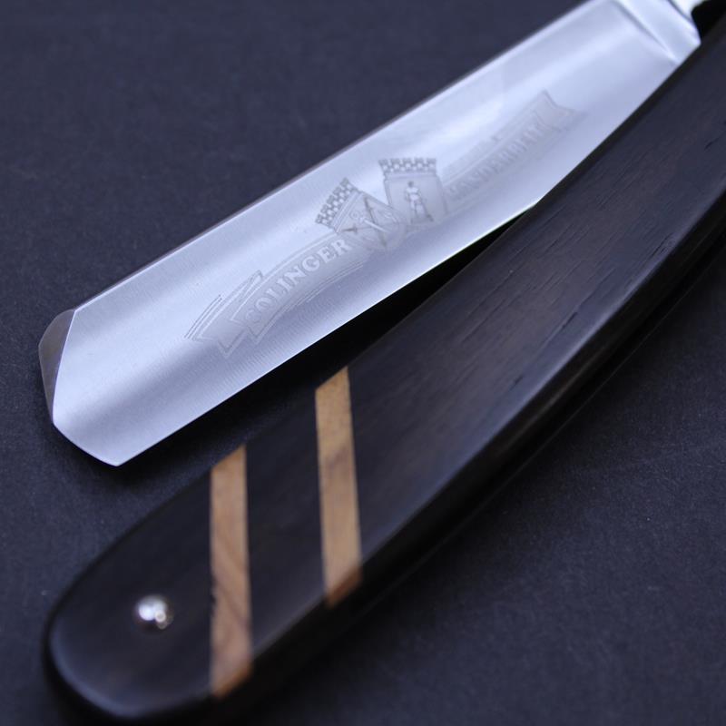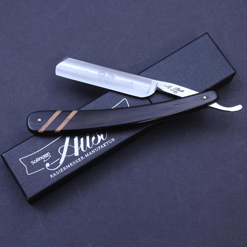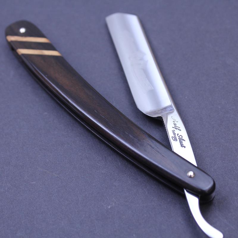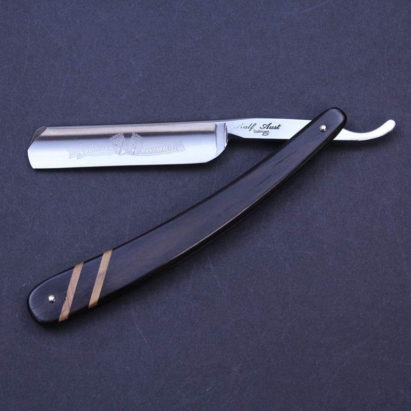 This stunning Ralf Aust razor has a 5/8 carbon steel blade with a satin finish, a round point and African blackwood scales. It has the usual “Ralf Aust Solingen” mark on the tang and the “Solingen Handarbeit” – handmade in Solingen – mark on the blade. This razor is the same as to the razor with code IE280023, yet slightly different as the spine has a champfered point, giving the round point a slightly more modern look.