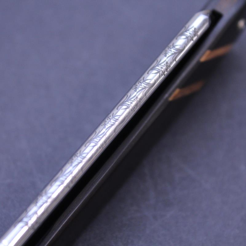 The African blackwood scales vary in colour from dark red to almost black and is a like a cross between cocobolo and ebony. This type of wood a good choice as it is robust and has water repellent properties which means that the scales will retain their appeal. But what makes these scales different from our other razors bearing african blackwood scales is the olivewood inlay which adds a beautiful contrast. The tang has jimping to both the upper and lower sides and the spine has a laser etched flower pattern to the top. All in all this goes to show that beautiful things do come in small sizes ! All Ralf Aust razors have a full hollow ground blade.